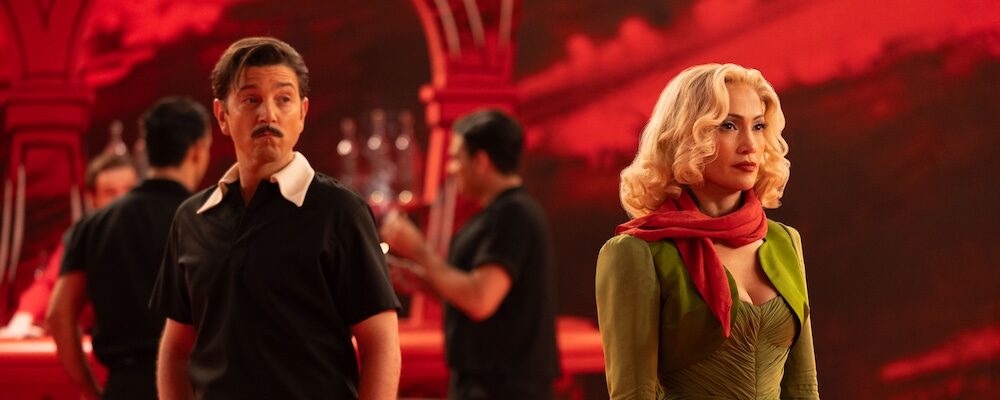 The basics of the story remain intact, now returned to its original setting of Argentina in the time of the junta. Luis Molina (Tonatiuh), a gay window dresser arrested for public indecency, arrives at a grimy prison to share a cell with Valentín Arregui (Diego Luna), a political prisoner. While Valentin quotes Lenin and reads political theory to conjure new articles, Luis obsesses over the glamorous movie stars he adores and whose posters grace his corner of the cell. To try and mentally escape from their situation, Luis begins narrating to Valentín the plot of a film starring his favorite star, Ingrid Luna (Jennifer Lopez). Here the film switches to the Technicolor world in Luis’ imagination, where Ingrid plays a magazine editor, Aurora, caught in the intrigues of a dashing photographer named Armando (Luna) and gangsters in a rural town. Luis has of course inserted himself into the tale as Aurora’s assistant, Kendall. But in the real world, Luis is also under pressure from the prison warden (Bruno Bichir) to extract information from his revolutionary new friend.